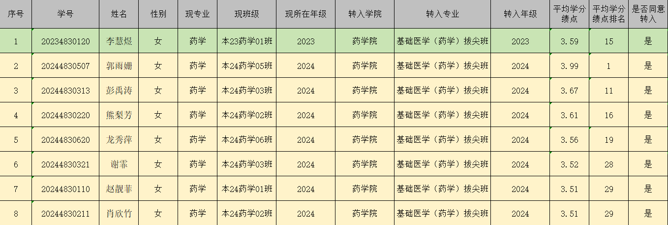 经学生本人申请、学院审核,按照平均学分绩点由高到低排列,拟同意李慧煜转入2023级基础医学(药学)拔尖班学习,郭雨姗等7人转入2024级基础医学(药学)拔尖班学习。现将名单公示如下,公示期为2025年9月28日至2025年9月30日18:00。如有异议,请以书面形式递交太阳集团城娱8722教务办,联系电话:0734-8281782。