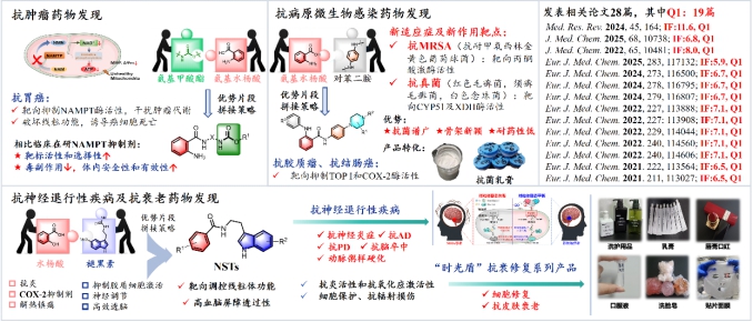 太阳集团tcy8722药物设计与研发团队长期致力于基于片段的药物分子设计,以邻氨基苯甲酰为母核,融合具有良好成药性和明确定义靶点的药效片段,围绕肿瘤、病原微生物感染及神经退行性等重大疾病,发现了多个具备临床开发价值的抗真菌/细菌、抗胃癌、抗线粒体损伤相关性疾病的候选药物。目前,该团队正积极推进科技成果转化,依托自主成立的衡阳泽岐生物医药有限公司,在A轮融资的支持下完成了抗菌乳膏、修复面膜、抗菌日化品等多个品种的初步工艺研究,未来将开展下一轮的项目融资,全力推进产品落地应用。