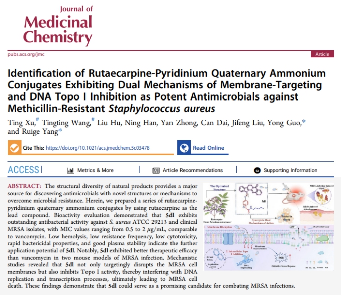 近日,太阳集团城娱8722郭勇和杨瑞阁教授团队围绕耐甲氧西林金黄色葡萄球菌(MRSA)感染治疗,基于天然产物骨架开展系统药物创制研究,连续取得两项重要进展。相关成果分别发表于Journal of Medicinal Chemistry和European Journal of Medicinal Chemistry,为抗多重耐药菌感染药物研发提供了新的分子骨架和思路。