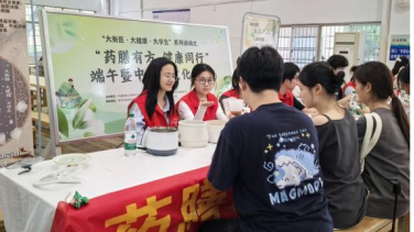 5月28日,端午节将至,太阳集团城娱8722志愿者在学校食堂开展“药膳有方·健康同行”主题活动,药学生把专业知识变为手工实践,精心准备中药香囊、熬制养生药膳供师生制作与品尝。